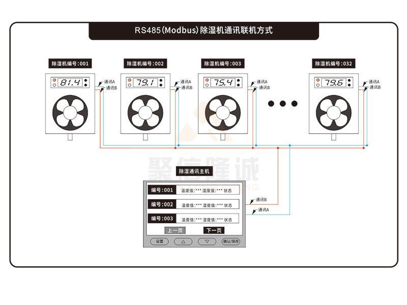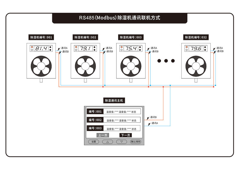 系統(tǒng)主要由:一臺(tái)主機(jī)和若干臺(tái)(1~32臺(tái))抽濕器子機(jī)構(gòu)成;抽濕器子機(jī)主要負(fù)責(zé)數(shù)據(jù)采集、環(huán)境控制和數(shù)據(jù)上傳;主機(jī)主要負(fù)責(zé):數(shù)據(jù)分析、數(shù)據(jù)保存和相關(guān)參數(shù)設(shè)置。主機(jī)與抽濕器子機(jī)之間采用485通訊連接。